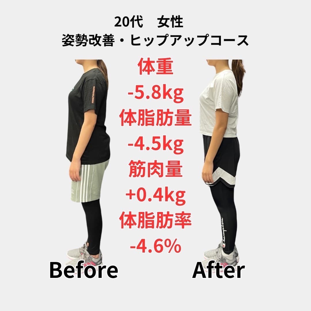 5キロの減量でもしっかり筋力もつけれて、身体の使い方も教えていただき、反り腰も改善でき、体重以上に見た目が引き締まったので自分に自信を持つことができました。自分の生活に合わせてアドバイスくださるので本当に楽しくトレーニングできています。