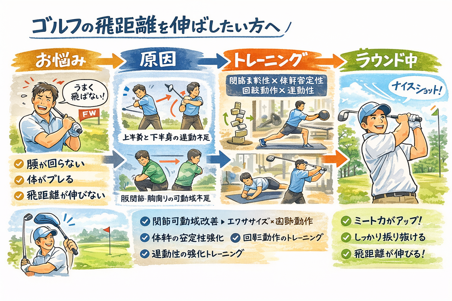 ゴルフの飛距離アップを目的にトレーニングに通い始めて4ヶ月になります。股関節の使い方や胸椎の可動域アップを実感できるようになり、ドライバーの飛距離も10ヤード程アップしました。飽きないようにメニューも色々考えて頂き楽しくトレーニングを続ける事ができています。さらなる飛距離アップを期待して今後も続けて行こうと考えています。